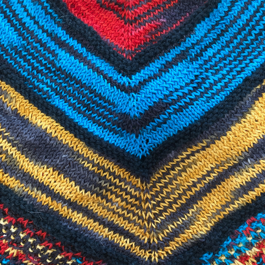 The cowl begins with a garter tab. Setup like a triangular shawl, the cowl is knit flat until large enough to join in the round. The flat section includes three stockinette sections (one for each Star Fleet color) with black garter stripes between. Once joined in the round and knitting black garter border, you enter the Transporter and all hell breaks loose! The Star Fleet colors/identities mix it up with slipped stitch rows. This portion of the pattern is provided both with written instructions as well as 3 charts. The stitching is easy, generally 1 or 2 slipped stitches and 1 or 2 knitted or purled stitches. It can be hard to visually keep track because of the way the yarn is dyed (sometimes both the stitch you are knitting with your working yarn and the stitch you are slipping will be black! If you get off pattern it is not too big a deal as long as you keep track of the increases.